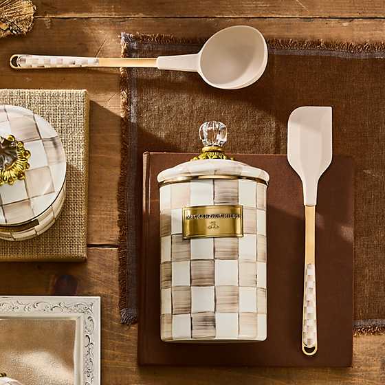 Stir up signature style with our Mocha Check Spatula, featuring a silicone-coated head and a bronzed stainless-steel handle bedecked in coffee-colored checks.