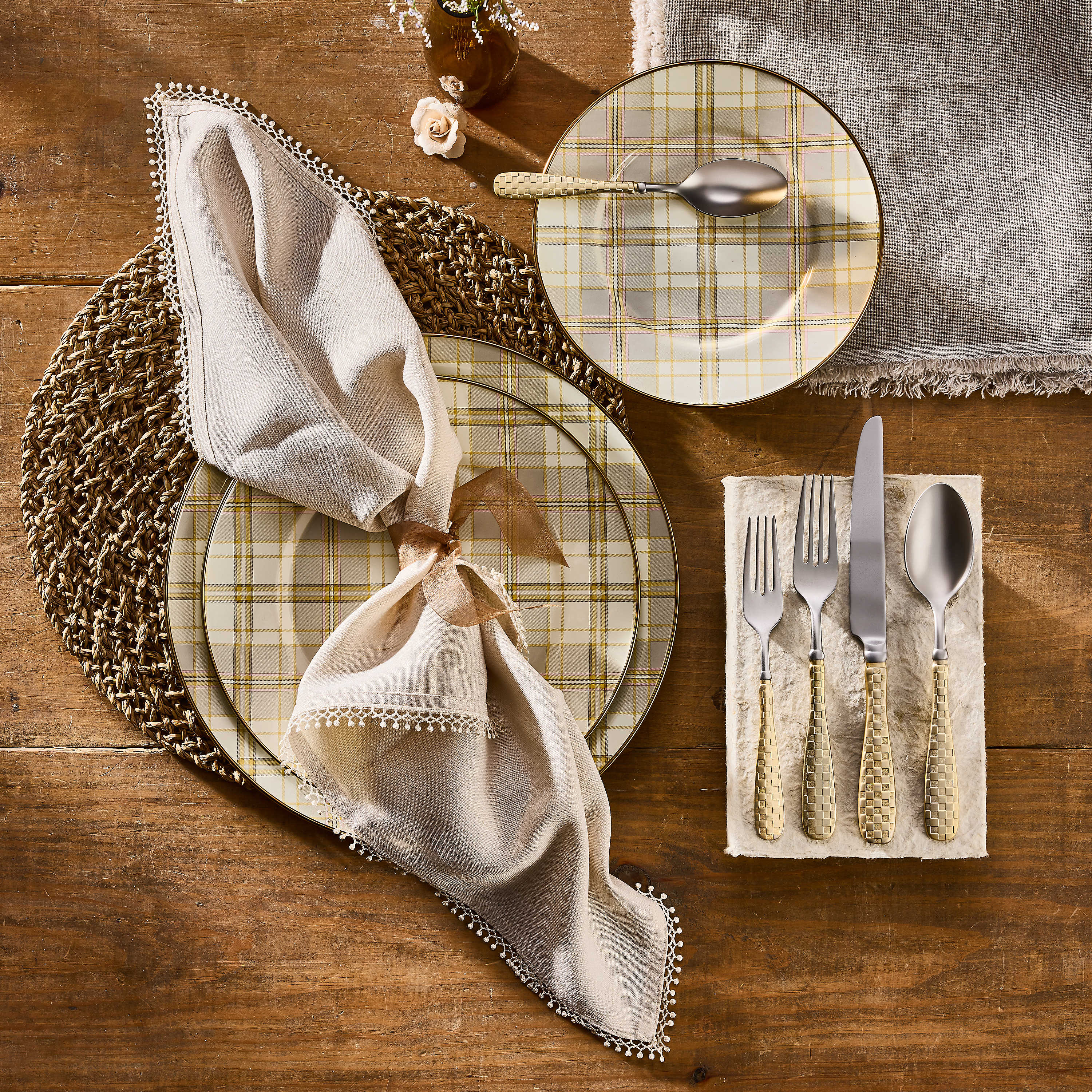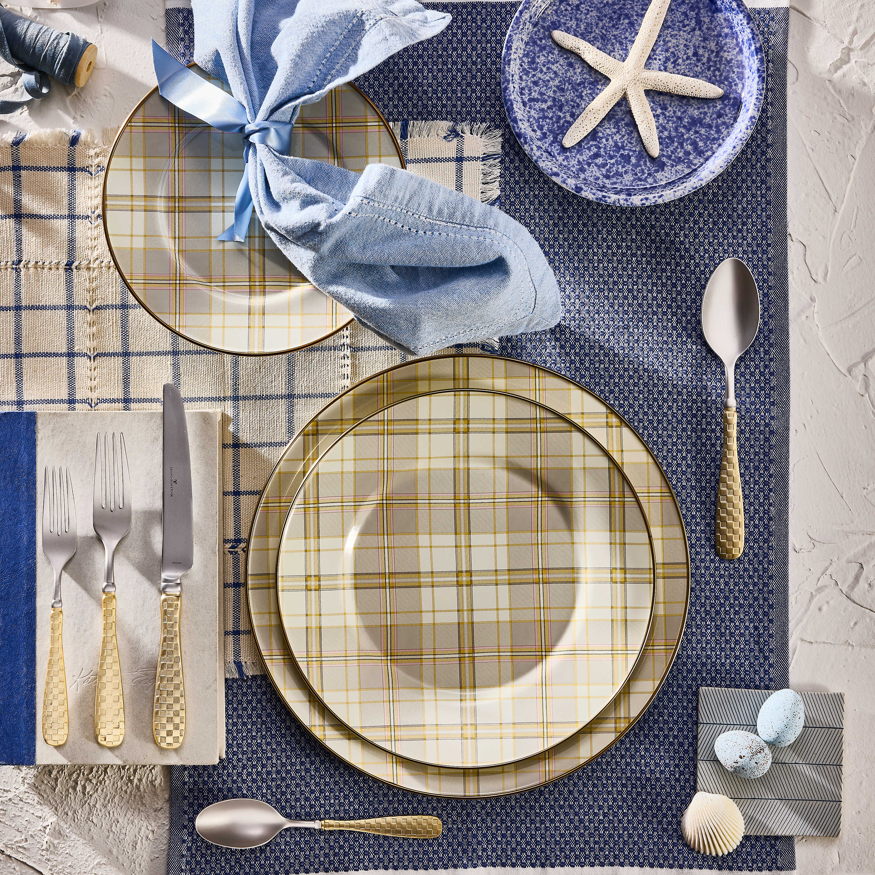 Set a place at the table for this latte-colored tartan dinner plate. It’s made of heavy-gauge steel and rimmed in bronzed stainless steel.