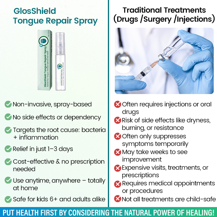 “ GlosShield Tongue Repair Spray has been widely recognized by dental researchers and ENT specialists as a breakthrough in mucosal healing and tongue care. Its advanced botanical micro-spray technology is designed to penetrate deeply into inflamed and irritated tongue tissue, promoting rapid, root-level healing. Clinical studies have consistently shown that GlosShield’s triple-action formula significantly improves symptoms such as tongue swelling, white coating, dryness, pain, and bacterial buildup within just days of use. Unlike conventional mouthwashes or topical gels that offer only surface-level relief, GlosShield works at a deeper level—without causing irritation, stinging, or relying on synthetic chemicals. This innovation represents a new standard in at-home tongue and oral care, delivering professional-grade results in a gentle, convenient spray.”
