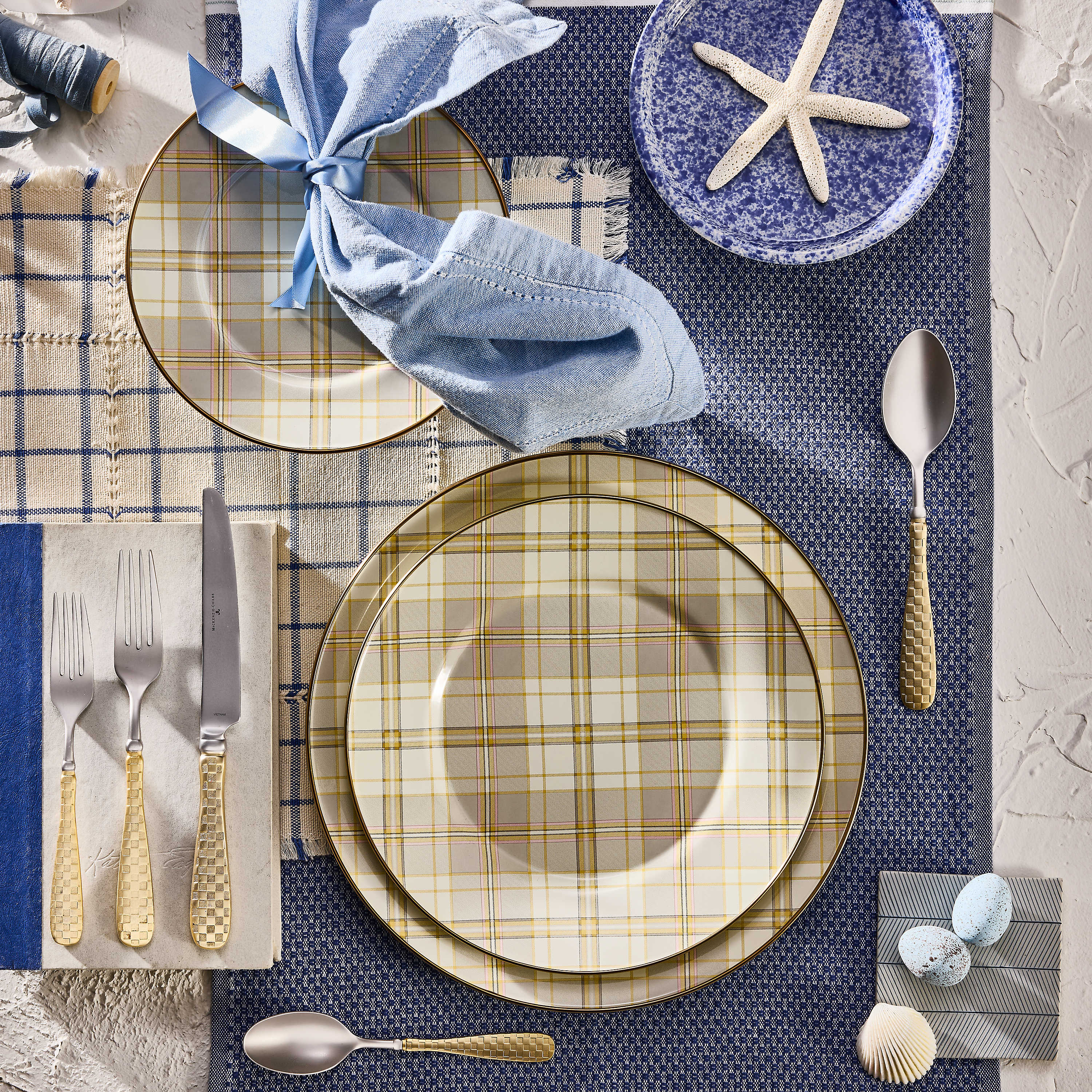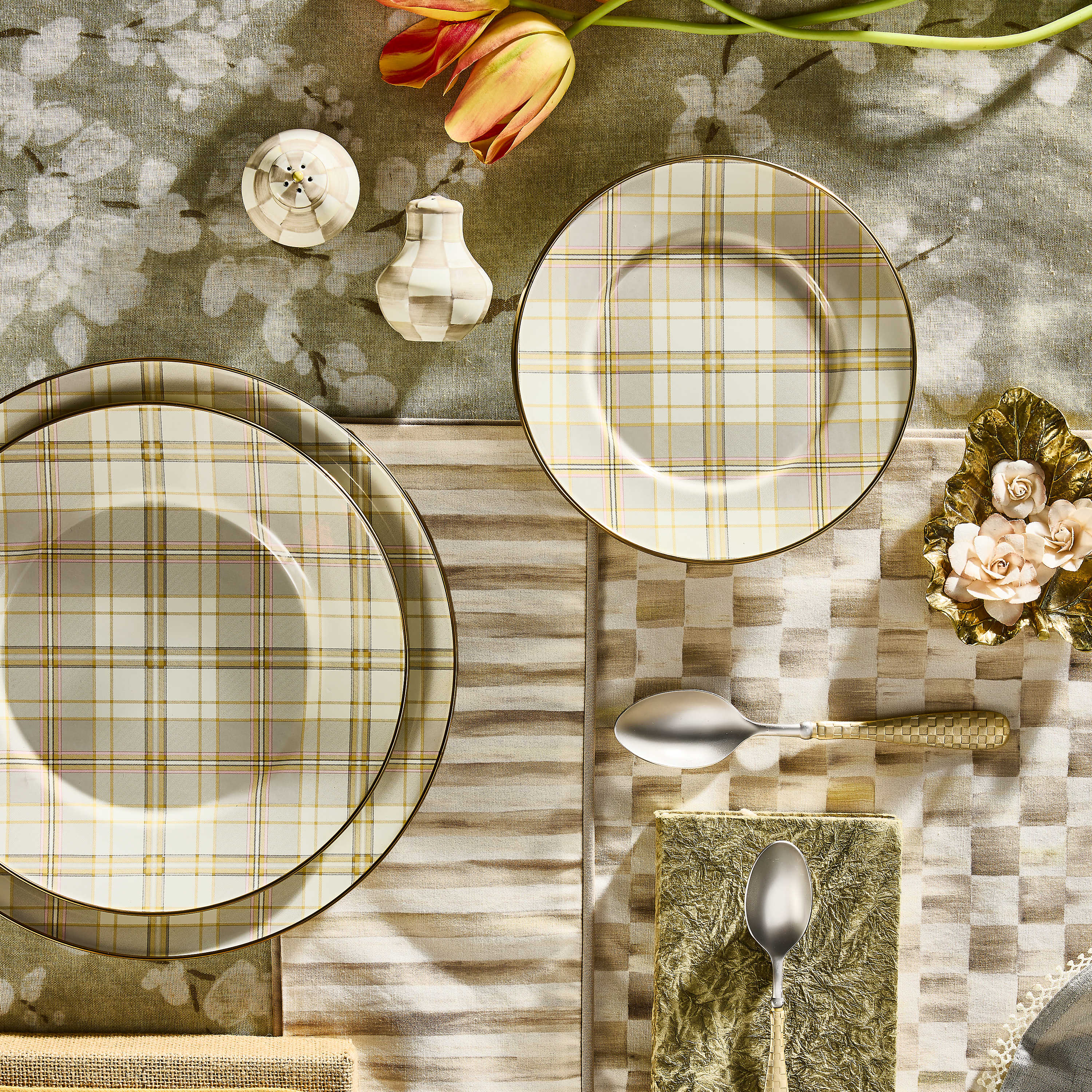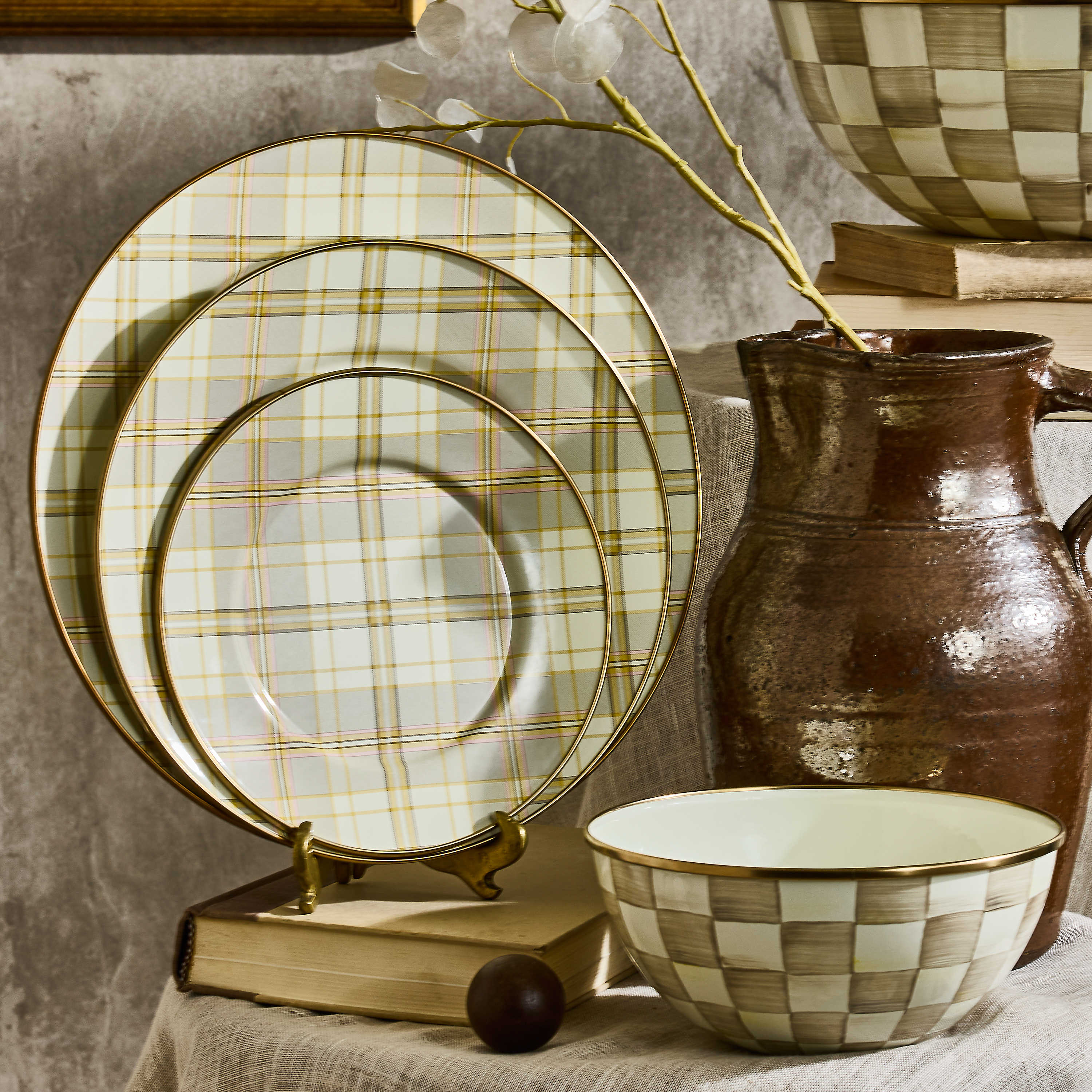 Set a place at the table for this latte-colored tartan salad plate. It’s made of heavy-gauge steel and rimmed in bronzed stainless steel.