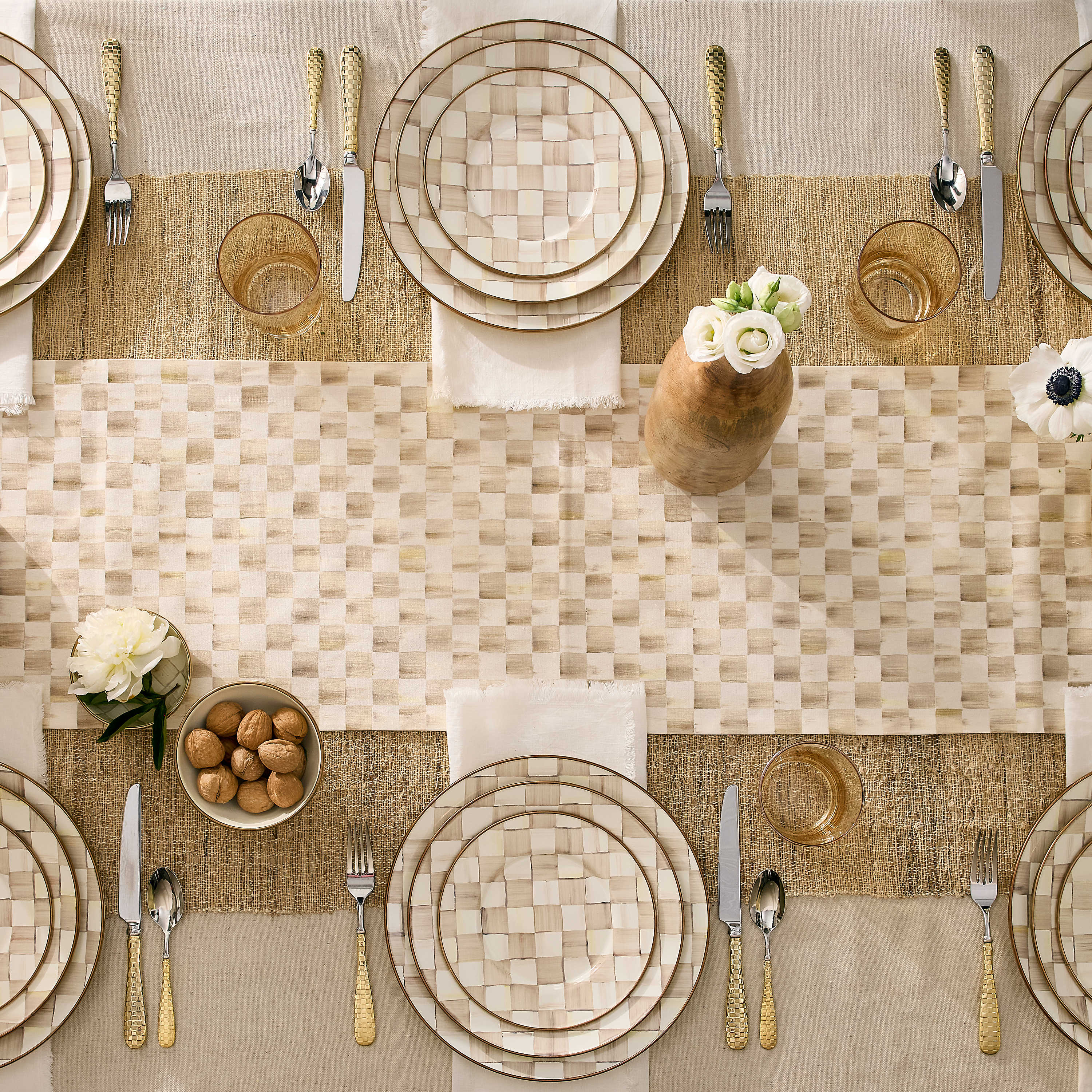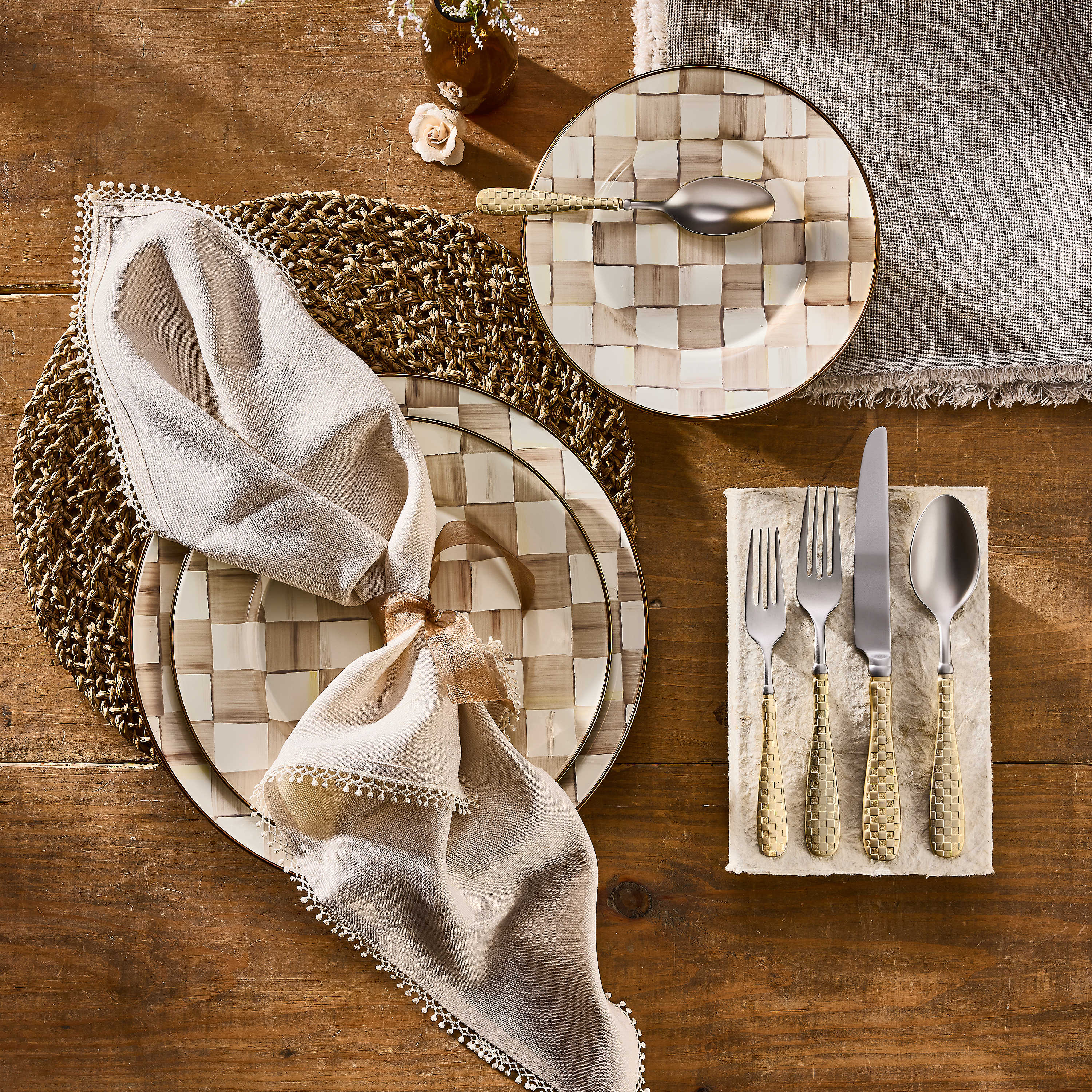 Set a place at the table for our Mocha Check Charger/Plate. Similar in theme to our signature enamel Courtly Check® pattern, Mocha Check features coffee-colored checks that are hand-painted and rimmed in bronzed stainless steel.