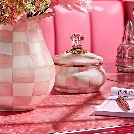 The Rosy Check Enamel Squashed Pot more than pulls its weight because this chubby silhouette holds an impressive 20 ounces. Its heavy-gauge steel underbody is color-glazed, hand-painted with color-dragged checks in a range of rosy hues, rimmed in bronzed stainless steel, and topped with an elegant clear glass knob.