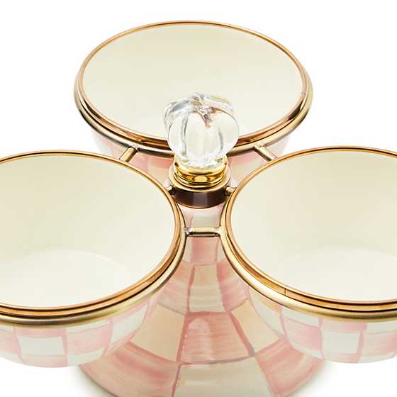The Rosy Check® Triplicity brings a little height to your kitchen displays while saving on precious counter space. The stand and accompanying 1.5 cup Pinch Bowls are hand-glazed heavy-gauge steel with hand-painted Rosy Check decoration. The bowls remove from the stand for easy cleaning.