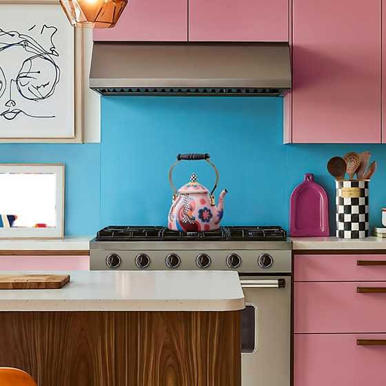 Suit your personali-tea with The Tea Kettle Collective. Strut your retro fashion flair with the Go Go 2 Quart Tea Kettle. It features bold and bright graphics from artist Bijou Karman on a heavy-gauge steel underbody, finished with a wood handle and a black and white check knob on the lid. Each special-edition Collective kettle makes a great cup of tea, of course, and adds MacKenzie-Childs style to your stovetop. Don’t be surprised that you need more than one.