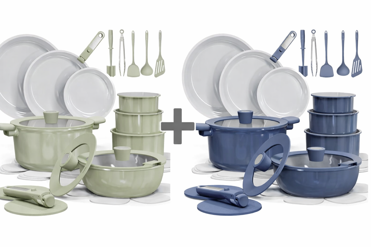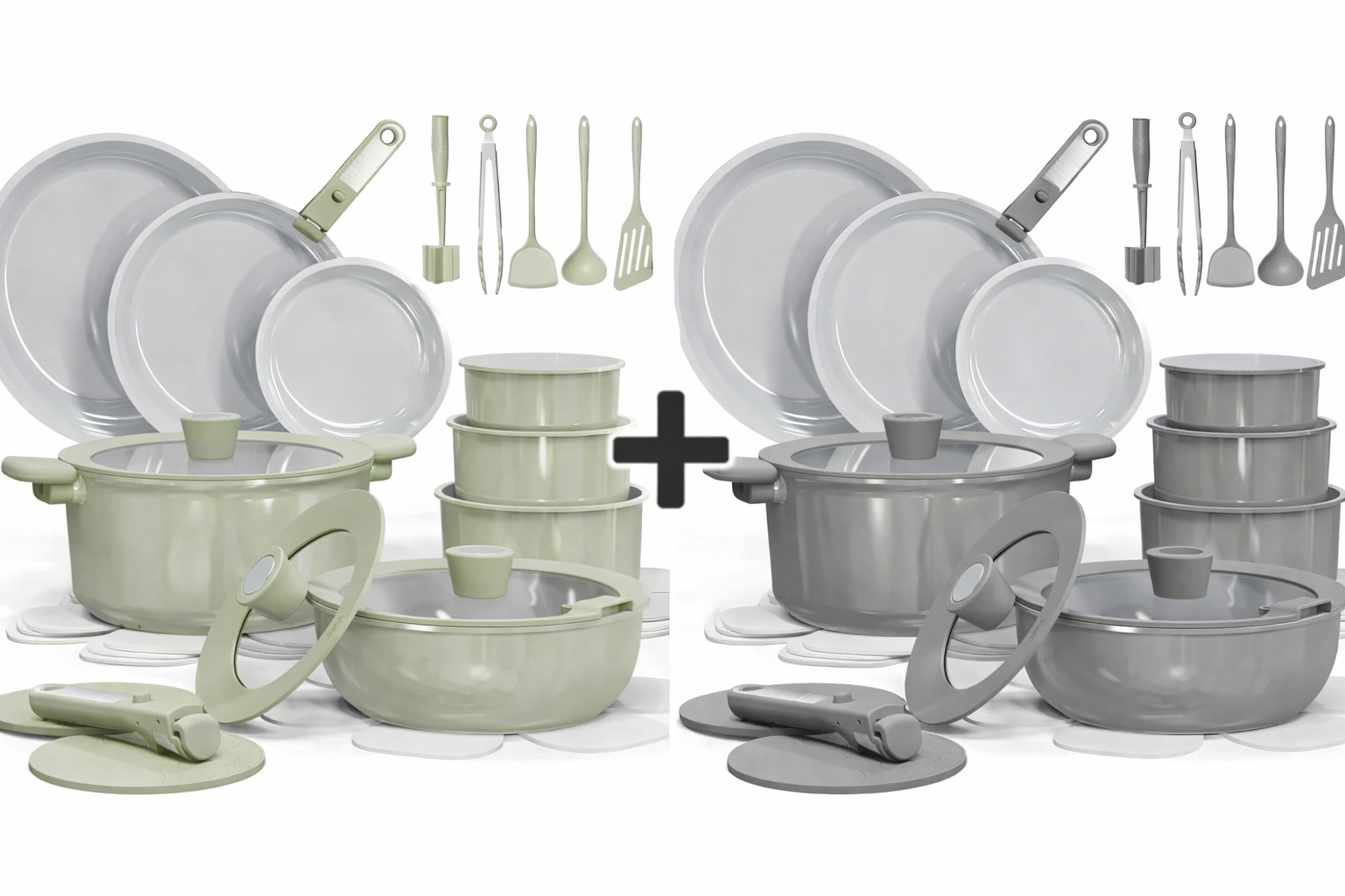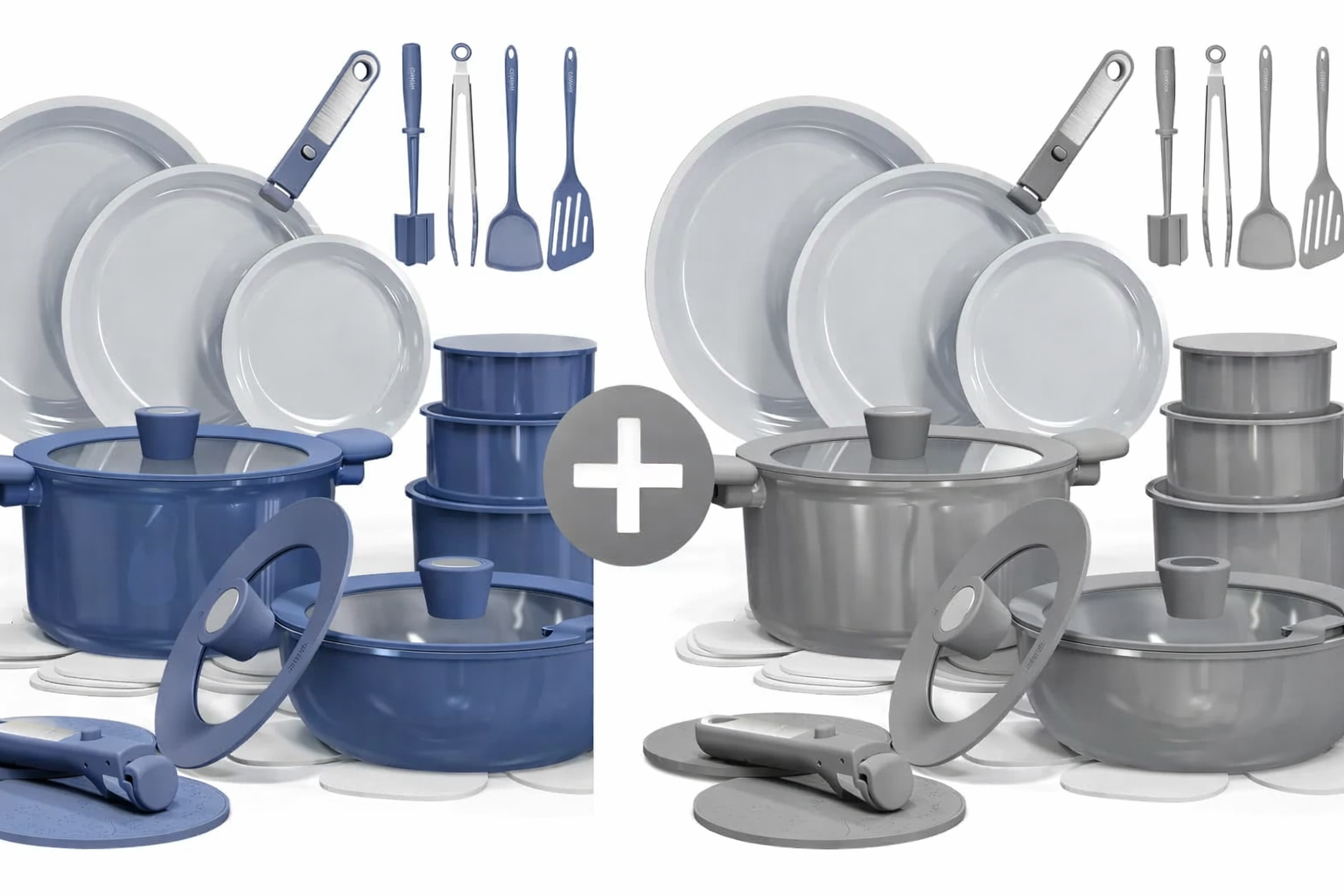 Set Includes: 8'' fry pan, 10'' fry pan, 12'' fry pan, 1.5-qt saucepan, 3-qt saucepan, 4-qt saucepan, 4-qt sauté pan with lid, 4.5-qt stockpot with lid, 7''-8''-8.5'' universal lid, 2*trivets, 2*detachable handles, fish turner, solid turner, ladle, tongs, potato masher, 7*pan protectors.
